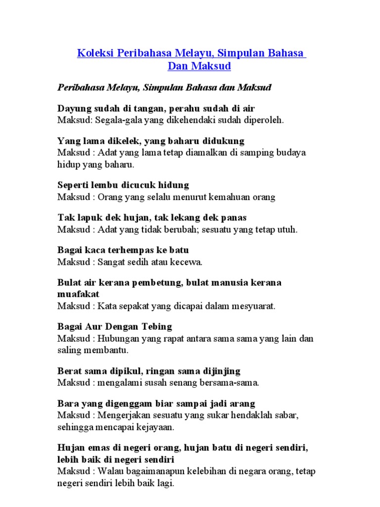 Bahasa melayu pepatah dan bidalan. Peribahasa terbahagi kepada simpulan bahasa, pepatah, perumpamaan dan bidalan. Tuah ayam nampak di kaki, tuah manusia siapa yang tahu. Pepatah ini membawa maksud, bagaimana baik pun keadaan di tempat dan negara lain, tempat atau negara kita sendiri tetap lebih baik. Kalah menjadi abu, menang menjadi arang. Peribahasa adalah satu susunan kata atau ayat yang mempunyai maksud tertentu yang merujuk kepada maksud berkias, berlapik dan tersirat. Walaupun kalah atau menang dalam sesuatu perselisihan. Pepatah adalah ayat atau kelompok kata yang mempunyai susunan yang tetap dan mengandung aturan dasar dalam berperilaku. Pepatah ini biasa dikiaskan kepada seseorang yang hendak memulai sesuatu pekeijaan atau sesuatu maksud, baru saja dimulai sudah ada alangannya. Dengan akal budi dan keyakinan pada diri sendiri, kita pasti akan berjaya. Peribahasa atau pepatah melayu ni bukan sahaja penting untuk bahasa melayu kertas 1 dalam karangan tapi penting. Tulisan pada kesempatan kali ini tentang kebahasaan yang merupakan kumpulan terlengkap berisi kamus pepatah bahasa melayu sastra lengkap dengan arti maksud dari kalimat tersebut. Kesalah fahaman ini adalah berpunca dari kegagalan memahami maksud adat dan sejarah munculnya.