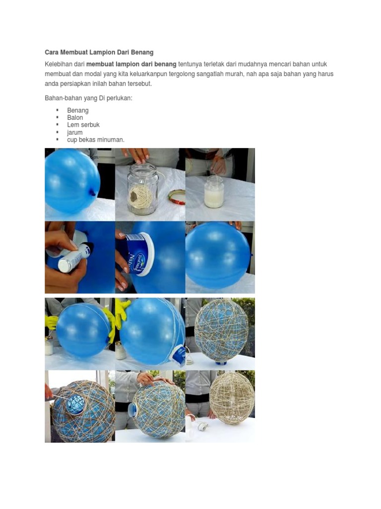 Siapkan bahannya tiup balon sampai ukurannya sesuai yg diinginkan liliitkan benang tidak searah diatas balon semakin banyak liliitan maka balon smakin tidak kelihatan dan cahaya jg semakin redup olesi benang dengan lem. Kita mulai yuk siapkan bahan. Lalu melilitkan benang yang sudah dicampur dengan lem kayu, mengkuti bentuk balon sehingga permukaan balon tertutup. Setelah itu kita rekatkan campuran benangnya pada balon yang telah ditiup tadi. Well, kamu bisa memanfaatkan kaleng makanan atau kaleng susu untuk. Lampion atau biasa disebut denglong oleh masyarakat tionghoa, merupakan sebuah kerajinan yang biasa dipakai di indonesia untuk penerangan kota. Cara membuat lampion benang, yaitu Dan lampion benang karakter buatan saya sudah jadi silahkan lihat bagus kan ? Berikut merupakan alat dan bahannya. Tiup balonya sesuai ukuran lampion yang akan di buat. Ember, gunting, sendok, pembolong, balon,plastik kresek. Kalo yang minat hub saya di 089629734435 semoga bermanfaat buat kalian. Untuk memanjatkan doa pada yang maha kuasa.