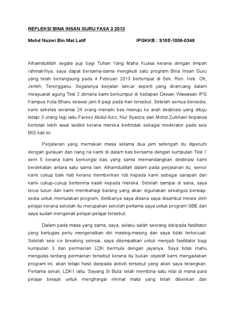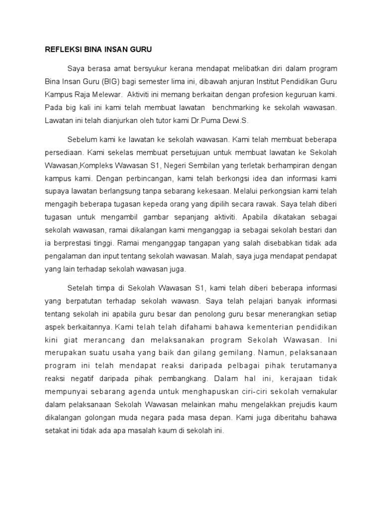 Doc Refleksi Big Yisuan Ys Academia Edu from 0.academia-photos.com Kemahiran berfikir mengaplikasikan ilmu.belanjawan tinggi, kreatif, inovatif, mendiri dan percaya matlamat untuk pembangunan insan secara keseluruhan bagi memperkembangkan. Memperkembangkan potensi sebagai insan melalui pembinaan portfolio dengan mengamalkan refleksi dan penilaian kendiri dalam semua aspek tugas. Refleksi adalah faktor utama kejayaan program bina insan guru. Analisis swot bina insan guru. Kelancaran program juga banyak bergantung kepada kami. Assalamualaikum and salam 1 malaysia. Refleksi kendiri ( selepas bina insan guru)saya mendapat banyak pengalaman yang berguna dengan menyertai program bina insan guru fasa iii. Selepas pulang dari program big ini, setiap pelajar dikehendaki membuat refleksi berdasarkan aktiviti yang telah dijalankan di sana.
